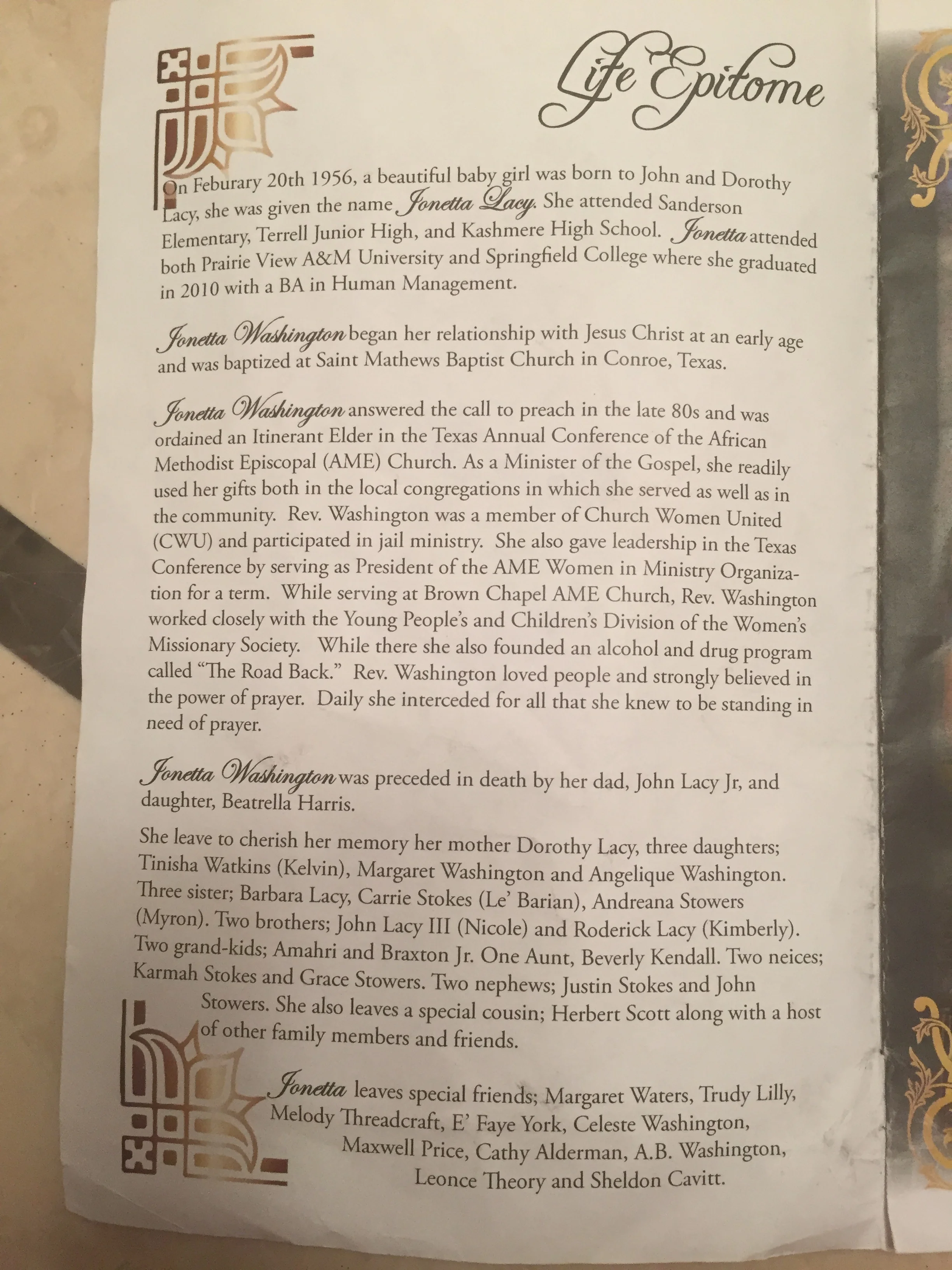 Rev Jonetta Faye Lacy born in Conroe, Texas on February 20, 1956 to John and Dorothy Lacy.